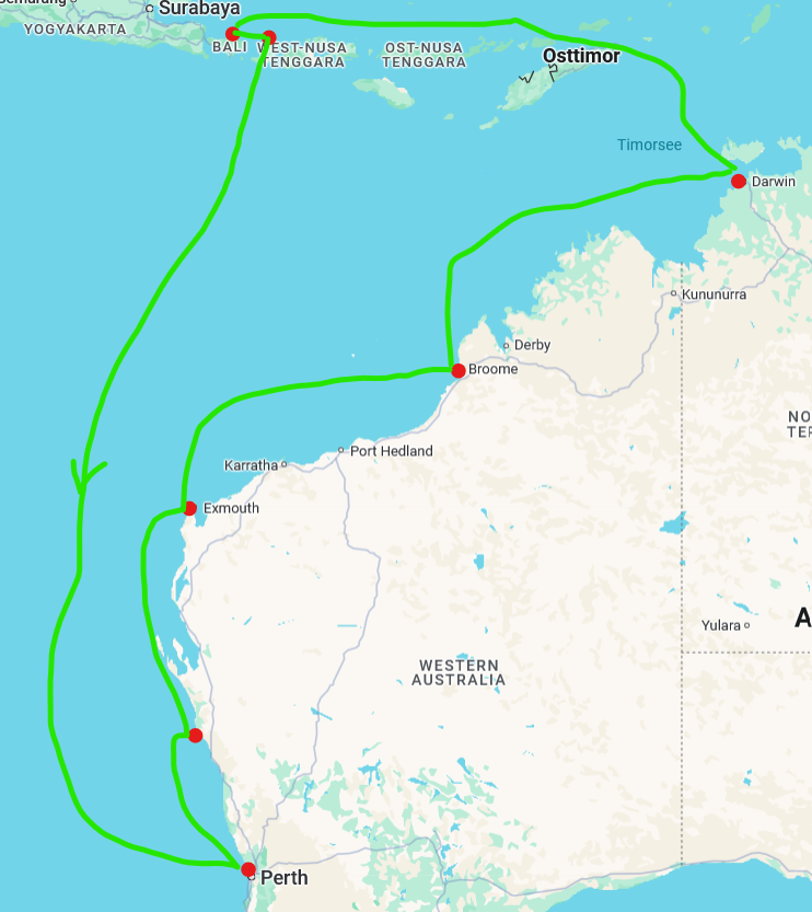 (Bali), (Bali), Lombok, Lombok, 4 Seetage, Perth, Perth, Geraldton, See, Exemouth, See, Broome, See, See/Darwin, Darwin, Darwin, See, See, (Bali), (Bali):