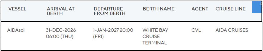 Das ist die Hafenmeldung für Sydney an Silvester 2026/2027. Die AIDAsol fährt als Weltreise die Südroute. Das zeigen (Stand heute) zumindest die Hafenmeldungen, die im Internet zu finden sind.