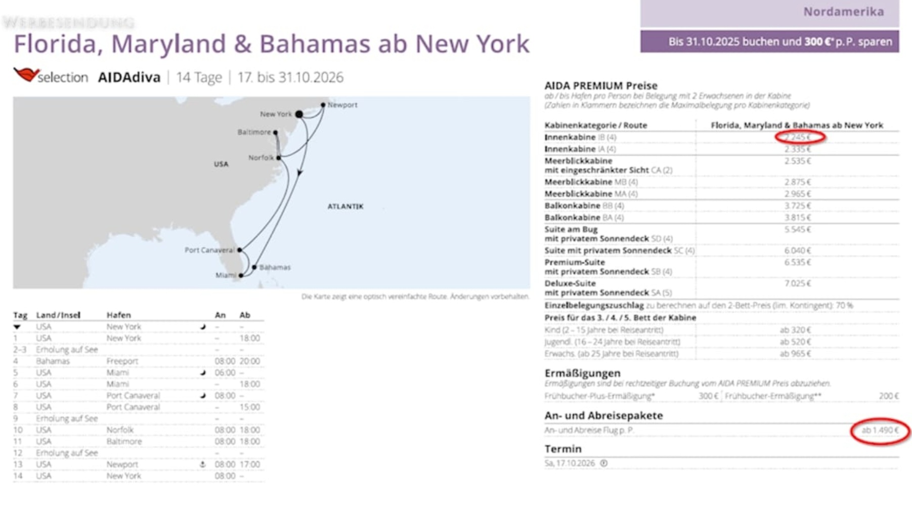 - Süden u.a.: Bahamas, Miami, Port Canaveral, Norfolk