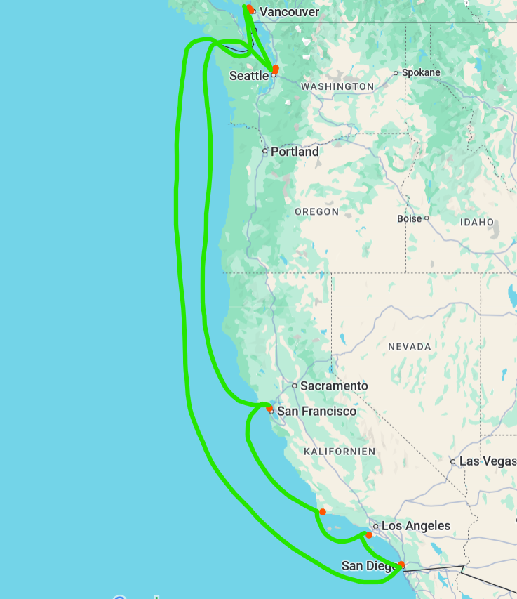 14 Tage: (Vancouver)- (Vancouver)- See- See- See- San Diego- LA- LA- Santa Barbara- See/ San Francisco Nachmittag- San Francisc -See- See- Seattle- (Vancouver)- (Vancouver):