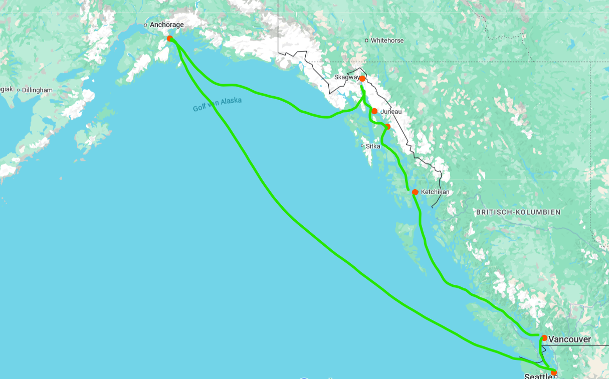 Für 14 Tage Alaska gibt es mehrer Optionen. Viele Häfen/ Gletscher wie Glacier Bay vergeben Lizenzen sehr weit in die Zukunft und ohne die kommt man da nicht rein. Der Hubbard Gletscher dürfte auch so geregelt werden. Es wäre also die Frage wo AIDA dann überhaupt noch hin fahren könnte, weil die US Reederein sich bereits eingedeckt haben. Whittier ist bei der Bahnlinie zum Denali (auf Wunsch von Trump bald wieder McKinley) Nationalpark. Diese beliebte Zugfahrt dauert wohl allerdings 8 Stunden, weshalb dort wenn dann ein Overnight nötig wäre. Der Carnival Konzern besitzt dazu die White Pass and Yukon Railway ab Skagway, die während eines Tagesausfluges zu realisieren ist. Außerdem können Kreuzfahrtschiffe noch Sitka, Haines, Prince Rupert (Kanada) und Icy Strait Point nur im südlichen Teil von Alaska anlaufen. Es ließen sich also diverse unterschiedliche zweiwöchige Routen bauen. Je südlicher sie bleiben, desto mehr Häfen können sie in der Zeit anlaufen. Ein Beispiel wäre z.B.: