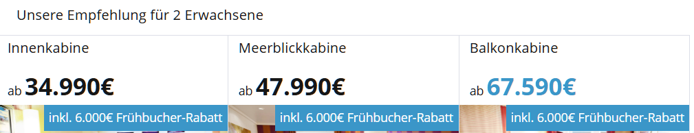 Hallo ,bei diesen Preisen pro Person und Kategorie sind die 3000 € Frühbucher pP schon mit eingerechnet.Heute Mittag 13 Uhr waren auf Deck 5 und 6 die in der Mitte liegenden Innenkabinen schon fast alle ausgebucht.