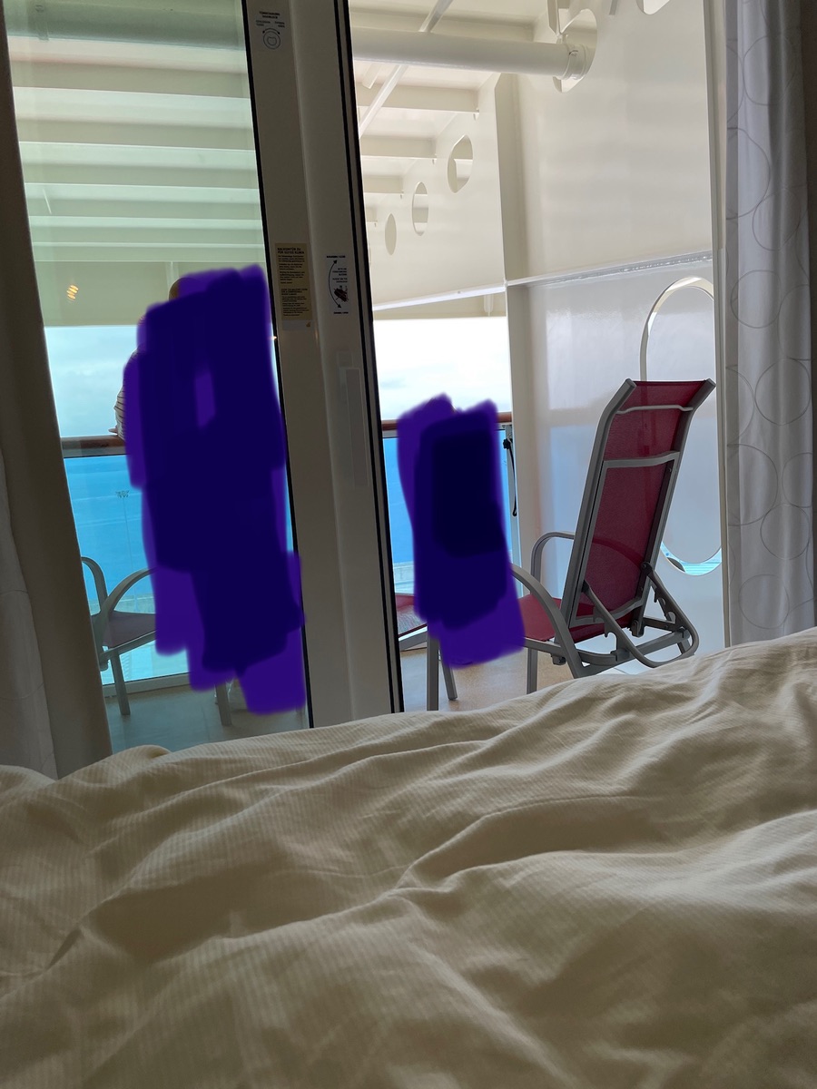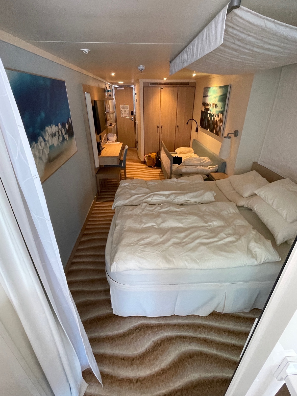 Die Veranda Comfort Kabine befindet sich direkt unter der Ocean Bar, von der man zum Glück in der Kabine nicht viel mitbekommt, auch morgens ist vom Deck über der Kabine nicht viel zu hören. Auf dem Balkon selber hört man natürlich die Schritte über einem schon deutlich, hat aber nicht so sehr gestört. Das Doppelbett steht am Balkon, das Sofa vor dem Kleiderschrank. Was uns wirklich gestört hat ist der Balkon: zurückgesetzt mit dem sehr großen Dachüberstand geht das Balkon-Feeling komplett verloren. Nach unten schaut man auf den Spa-Bereich, nach oben auf das auch die ganze Nacht beleuchtete Dach. Die Beleuchtung geht zwar noch von der Helligkeit (außer am letzten Abend, wo alles im knalligen Aida-Rot beleuchtet war, auch wenn nicht ganz so schlimm wie es auf dem Foto wirkt. Schön ist aber anders…)), trotzdem fehlt der entspannte Blick in den Himmel oder aufs Meer. Immerhin merkt man von der Beleuchtung nachts in der Kabine nichts, die Vorhänge erfüllen ihren Zweck sehr gut. Dafür hat man natürlich den ganzen Tag Schatten auf dem Balkon, aber Deck 16 oder 17 in der zurückgesetzten Lage würden wir niemals im Premium buchen, für Vario war es dann halt noch gerade so ok. Warum die Kabine eine bevorzugte Lage haben soll hat sich uns allerdings nicht erschlossen ![]()