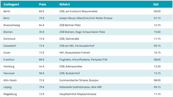 Google gibt für die Strecke ab Dortmund eine Fahrtzeit von 3,5h an. Gut, der Bus fährt langsamer, also geben wir ihm mal 4 bis 4,5h. Dann wäre die Ankunft am Terminal zwischen 15:00 und 16:00 Uhr. Das würde ja passen.