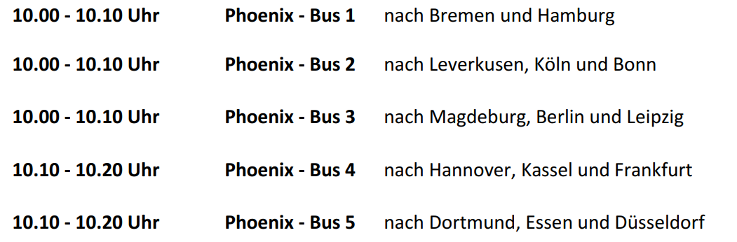 Ich vermute, dass der eine Bus in Bonn startet und dann über Köln, Düsseldorf, Essen und Dortmund fährt. Aber fährt der dann direkt nach Bremerhaven durch, oder hat der noch ein paar Stationen?