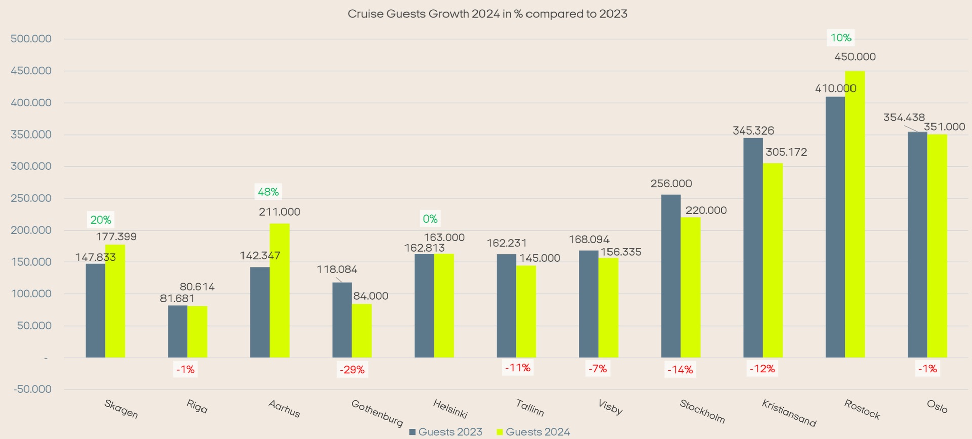 Die großen Verlierer sind aber nicht nur Tallinn oder Stockholm, auch die beiden größten Häfen in der Ostsee Kiel (-16%) und Kopenhagen (-7%) büßen dieses Jahr drastisch ein. Die größten Gewinner sind dieses Jahr die dänischen Häfen Arhus (+48%) sowie Skagen (+20%) und das Ostseebad Warnemünde (+10%).