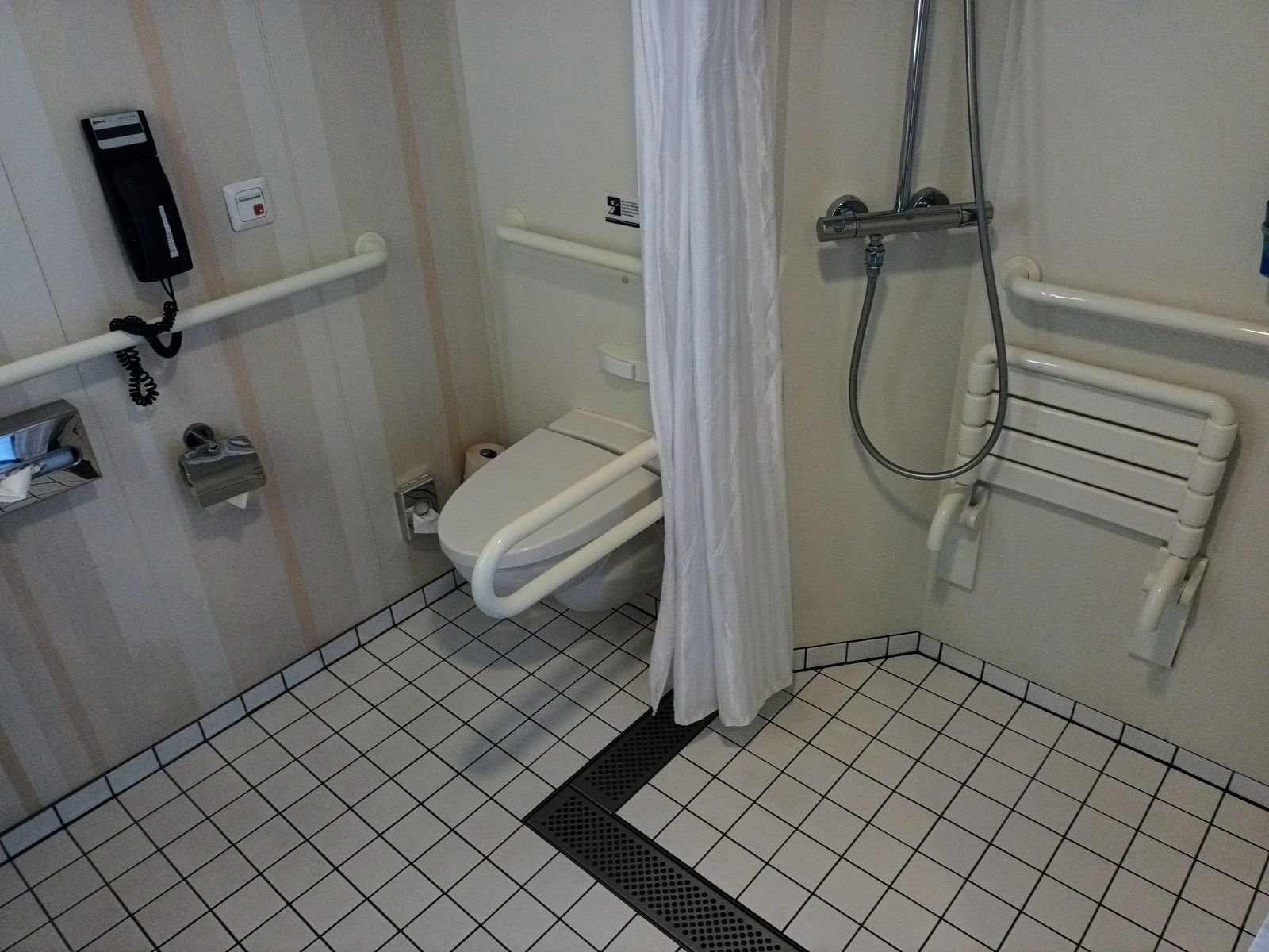 Das Bad war recht genial konstruiert. Satt der üblichen Türschwelle war direkt hinter der Tür ein breiter Bodenablauf montiert, so dass auch ohne Schwelle kein Wasser aus dem Bad "ausbüxen" konnte. Auch die Dusche war auf Bodenniveau mit Bodenabläufen rundherum. Es gab einen Duschvorhang. Ich denke, das muss so sein, denn eine normale Duschabtrennung wäre ja wieder mit einer kleinen Schwelle verbunden. Die Dusche selbst war deutlich größer als üblich. Es gab zusätzlich zu der Handdusche noch eine Regendusche und zwei herunterklappbare Duschhocker. Selbstverständlich war alles mit Rollstuhl zugänglich. Der Waschtisch kam mir niedriger vor, was in dem Zusammenhang Sinn macht.