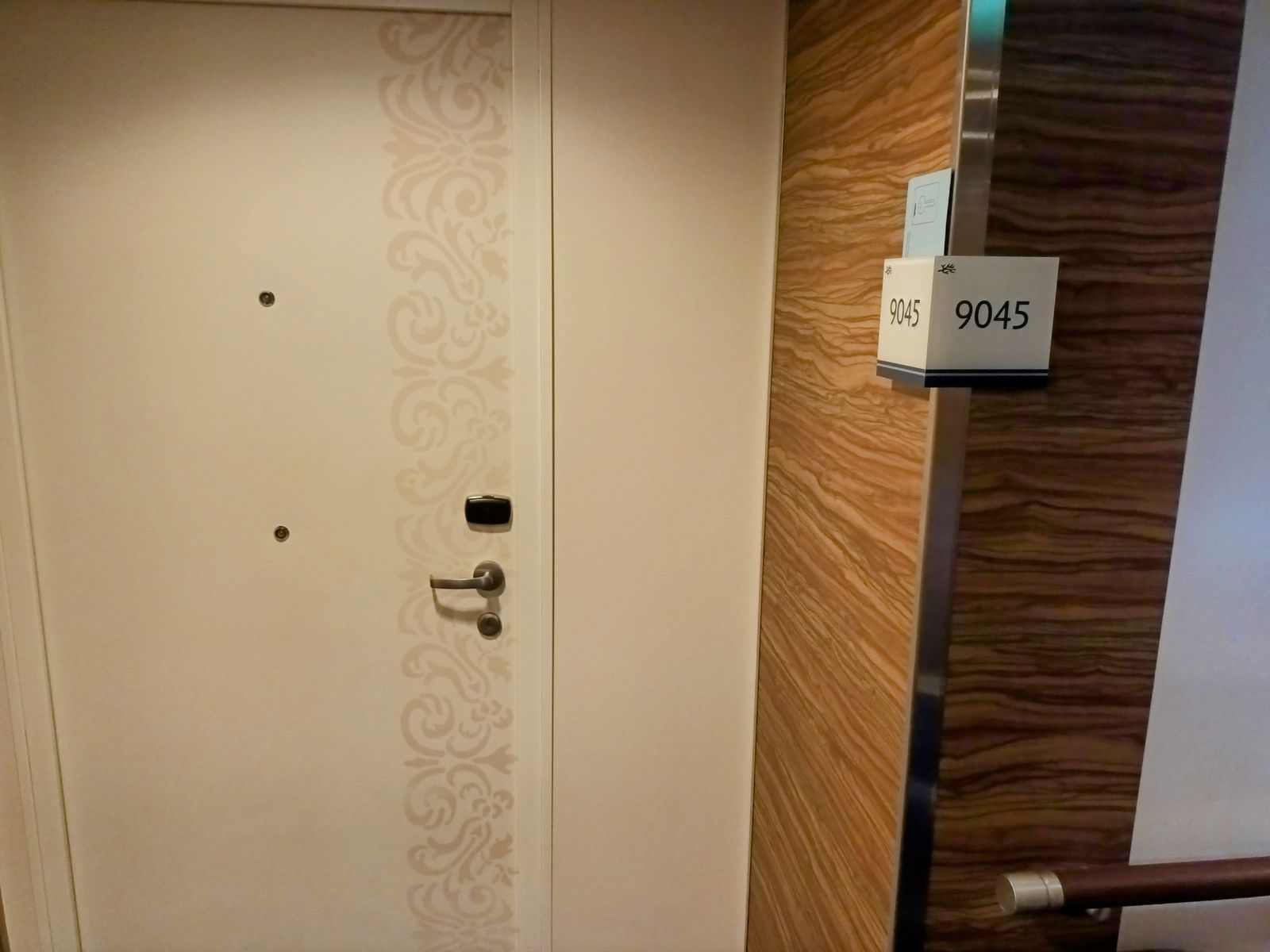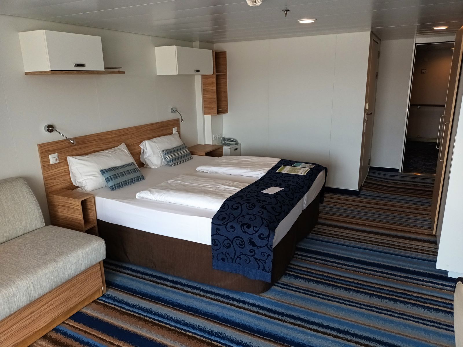Vom 11.6.23 bis 18.6.23 durften wir die barrierefreie Balkonkabine 9045 auf der Mein Schiff 5 bewohnen. Die Kabine haben wir im PUR Tarif zugewiesen bekommen. Dieser Kabinentyp ist 1 1/2 mal so breit, wie eine normale Balkonkabine und somit so groß, wie eine Juniorsuite. Das Bett steht in der Mitte. Vermutlich ist das bei allen barrierefreien Balkonkabinen so, denn vor dem Ausgang zum Balkon gibt es eine kleine Rampe um ggf. mit einem Rollstuhl auf den Balkon zu gelangen. Auch außen auf dem Balkon war eine Rampe mit einer kleinen Mechanik, die ein Teil der Rampe hoch klappt, wenn man die Tür schließt.