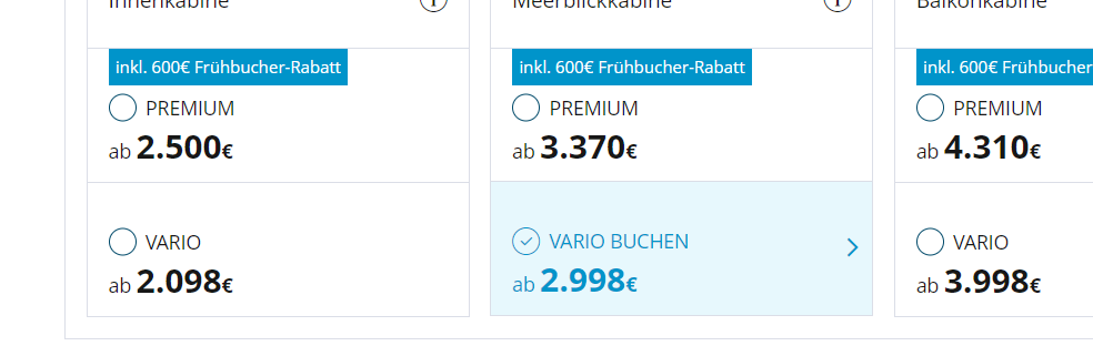 Wir würden eine Aussenkabine nehmen wollen. Wenn ich jetzt bei Aida direkt schaue, kann ich eine Aussenkabine Vario buchen und das war’s. Bei einem Onlinereisebüro kann ich dort noch unterscheiden zwischen MV, MA oder MB…Gibt es das nicht bei Aida direkt zu buchen oder bin ich blind? Ich würde etwas mehr zahlen, wenn ich dann keine Kabine bekommen würde, die mit den Tenderbooten etc verdeckt wäre..