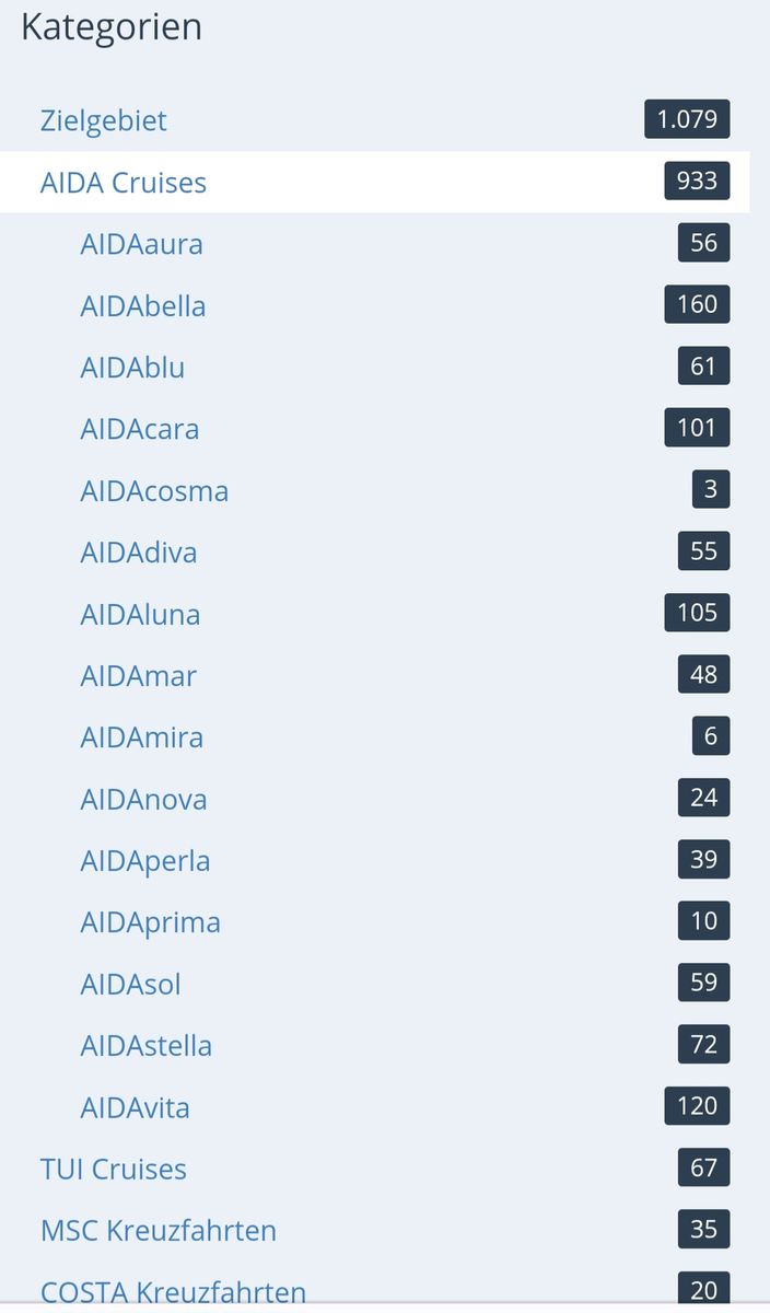1 x AIDA , 5 x AIDAcara , 6 x AIDAvita , 5 x AIDAaura , 1 x A'ROSA Blu , 0 x AIDAblu (alt)