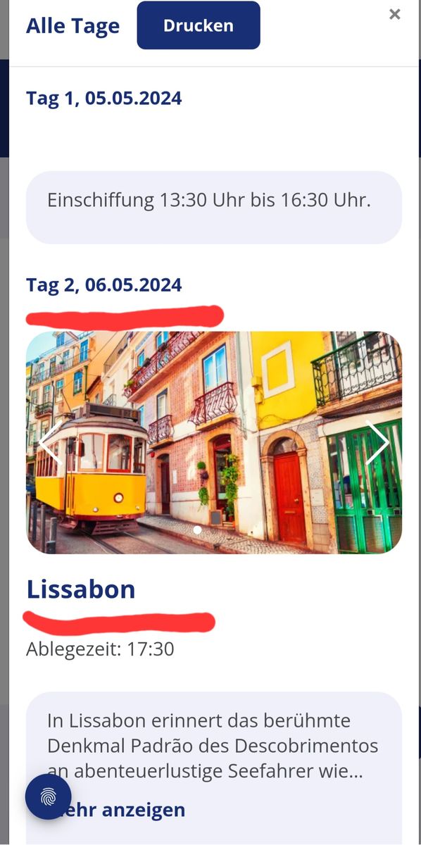 Wir haben die Reise vorher (also die von Dir genannte) und da wird immer noch die ursprüngliche Route Lissabon - Malta angezeigt, also doch vorübergehender IT Fehler :gruebel: