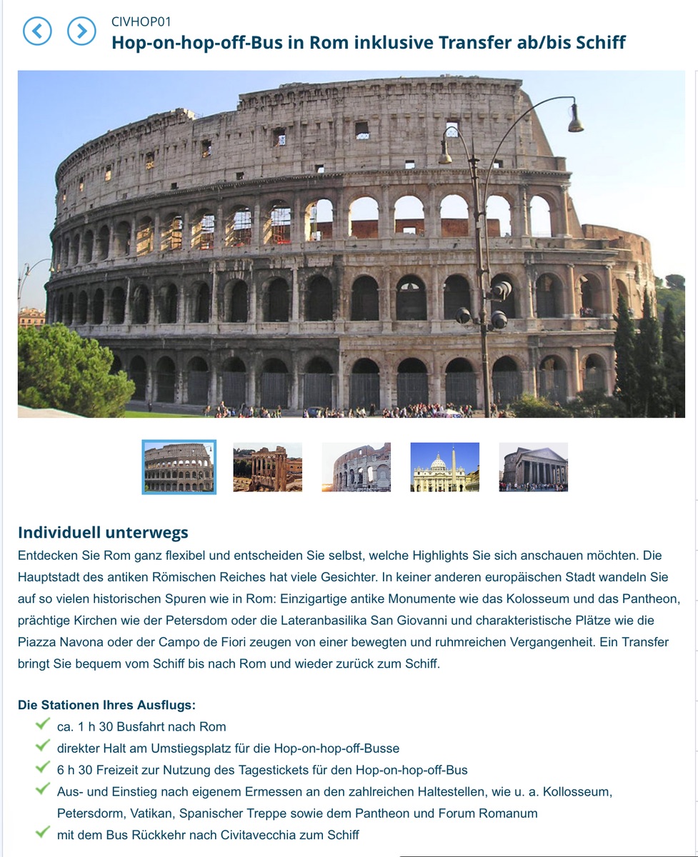 Rom haben wir über Aida den Bus plus Hopp of .. gebucht. Sind dadurch in Rom individuell unterwegs