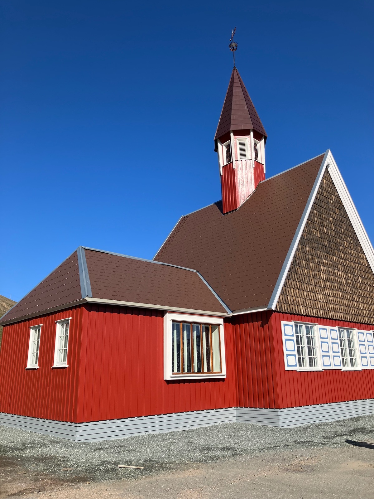 Die Kirche ist superschön. Sie ist am Hang gebaut, und der Eingang ist im unteren Teil, wo man erst in einen Raum mit Schuhregalen kommt. Auf Spitzbergen betritt man die meisten Gebäude ohne Schuhe (außer Supermarkt, Cafés etc.), und da kann man sie dann gut parken. Von da geht eine Treppe hoch, und da war ich erstmal überrascht. Im vorderen Teil ist ein sehr gemütlicher Gemeinderaum, und im zweiten Teil die eigentliche Kirche mit Altar.