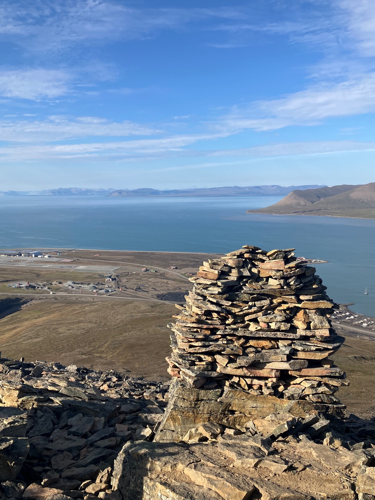 Je höher wir kamen, desto steiniger und „gerölliger“ wurde der Weg. Die ersten mussten aufgeben, aber da niemand wegen der Eisbärengefahr einfach irgendwo warten durfte, hat der eine Guide einen Kollegen angerufen, der dann mit dem Auto kam, und der Guide hat die beiden zum Auto zurück begleitet. Das schwierige an der Strecke war, dass es steil bergauf ging und nicht über Serpentinen, keine richtigen Wege, und irgendwann bestand der Untergrund nur noch aus diesen Steinen und Platten, die man auf dem nächsten Bild im Vordergrund sieht. Da musste man wirklich bei jedem Schritt erstmal antesten, ob der Stein hält oder locker ist. Ich muss sagen, dass ich mich selbst ziemlich sicher gefühlt habe (der Sukkertoppen war ein gutes Training, der war aber nicht ganz so krass), aber ein leicht mulmiges Gefühl, dass jemand anders fällt und die halbe Gruppe von den Beinen holt, war irgendwie die ganze Zeit da. Wir sind nämlich immer schön im Gänsemarsch da hoch. Es sind dann aber alle heil oben angekommen, obwohl der eine oder andere ein bisschen Sorge hatte, wie man da wieder runterkommt. 🙈 Die Aussicht war aber wirklich absolut lohnenswert: