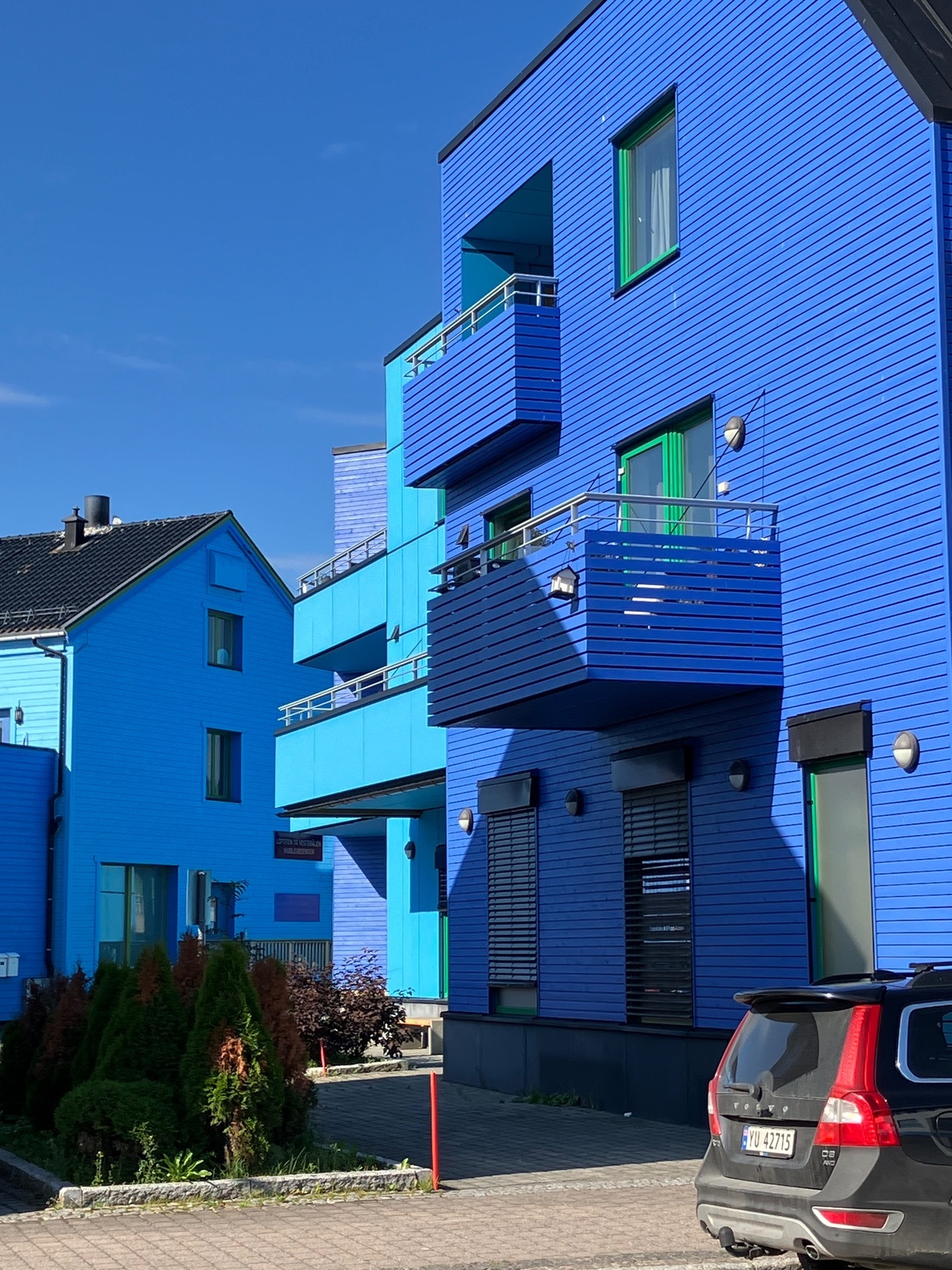 Ich muss leider sagen, dass mir der Ort Sortland selbst nicht besonders gefallen hat. Die Idee mit den blauen Häusern ist toll, und es haben auch viele mitgemacht, aber halt nicht zusammenhängend. Einen komplett blauen Straßenzug sucht man leider vergeblich. Dieses ist das einzige Foto mehrerer blauer Häuser, das ich hinbekommen habe: