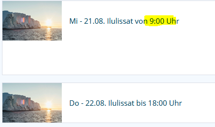 Bei uns wurde der Ausflug in Ilulissat von 15.00 uhr auf 16.30 Uhr verschoben. Das ist jetzt schon der zweite Ausflug bei dem die Uhrzeit verändert wurde🤬 den ersten haben wir daraufhin storniert und dann diesen gebucht. Ich finde es schon ärgerlich, denn ich habe die ursprüngliche Uhrzeit ja bewusst ausgewählt