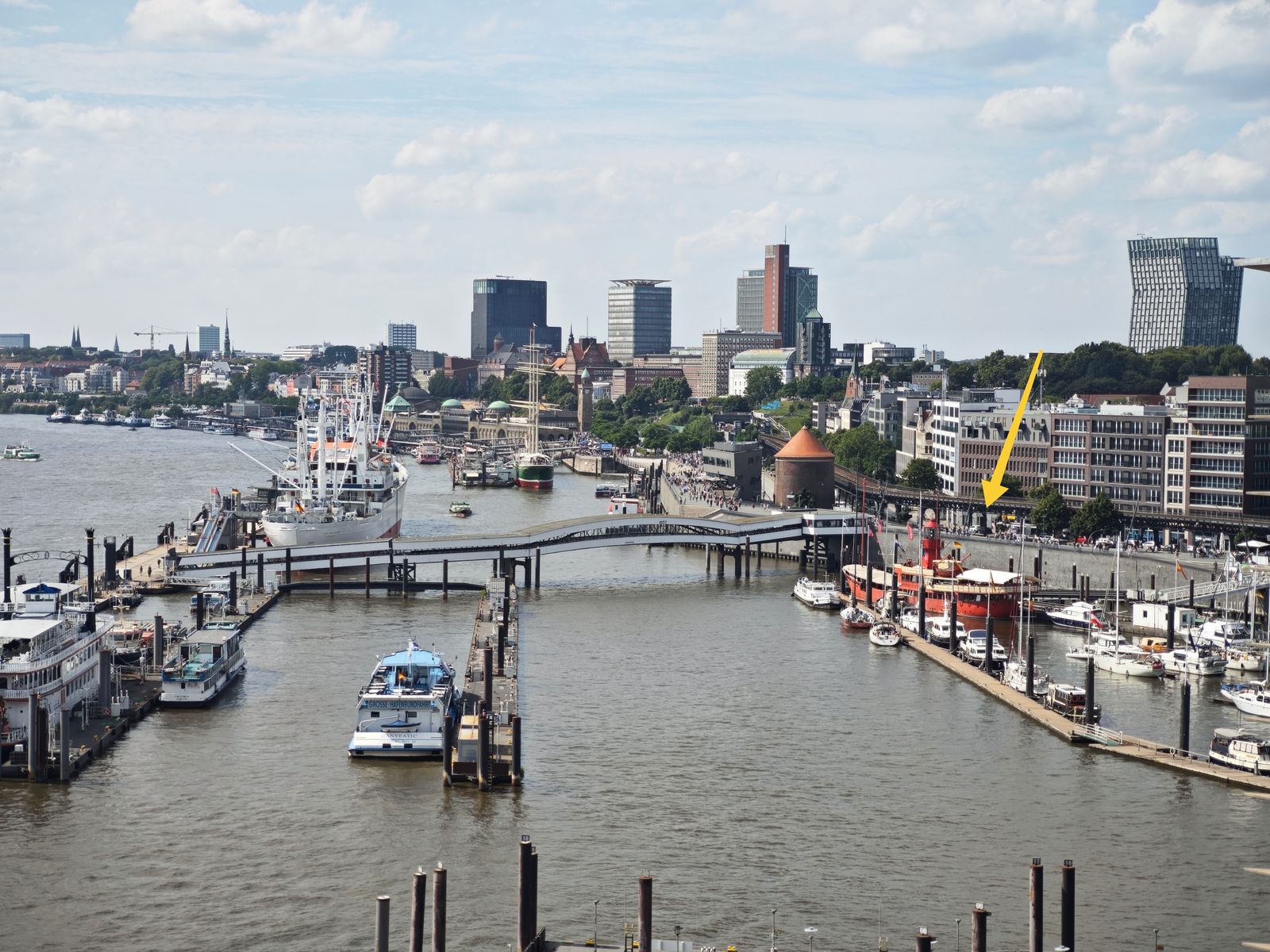 Ich sollte dann in sein Handy die Adresse eingeben. Selbst "City-Sporthafen" sagte ihm nämlich nichts. Auch mein Einwand, dass eigentlich doch er (wie sich ja nun zu unserem Schreck herausgestellt hatte) der Taxifahrer sei, nutzte nichts. Der Zusatz "Nähe Landungsbrücken" sagte ihm dann wenigstens was. Die kannte er wohl, wusste aber immer noch nicht, ob er an der nächsten Kreuzung rechts oder links abbiegen musste. Wir entschieden dann er soll links fahren. Das war offenbar richtig, denn irgendwann sahen wir den roten Turm vom Feuerschiff und baten drum, uns zu erlösen und anzuhalten. Eine weise Entscheidung, denn er faselte zwischendurch schon was von Altona. Hoffentlich hat der jemals überhaupt wieder zurück zum Hauptbahnhof gefunden.