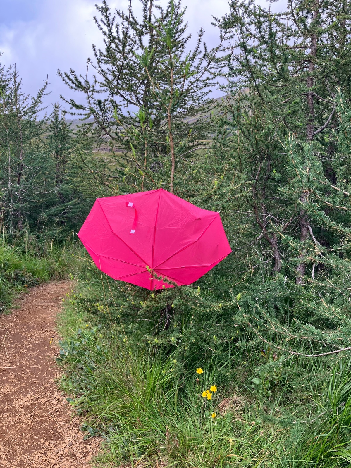 Nass bin ich nicht geworden. Die Regenhose war aber praktisch, weil der Wanderweg teilweise nur ein Trampelpfad durchs Gestrüpp war, und das war heute Vormittag alles noch nass. Und zur Not hätte ich sogar noch was gefunden. 😄