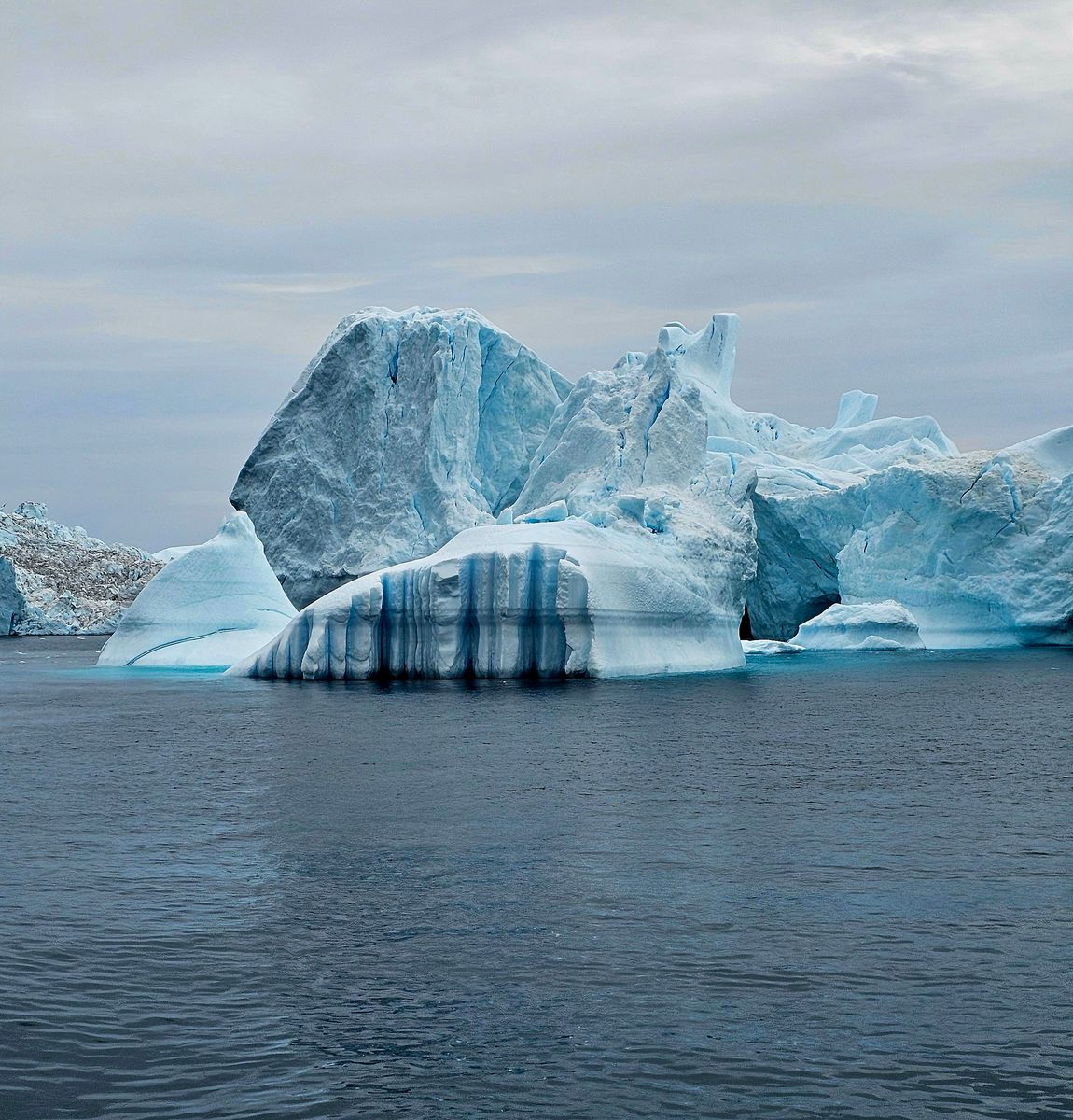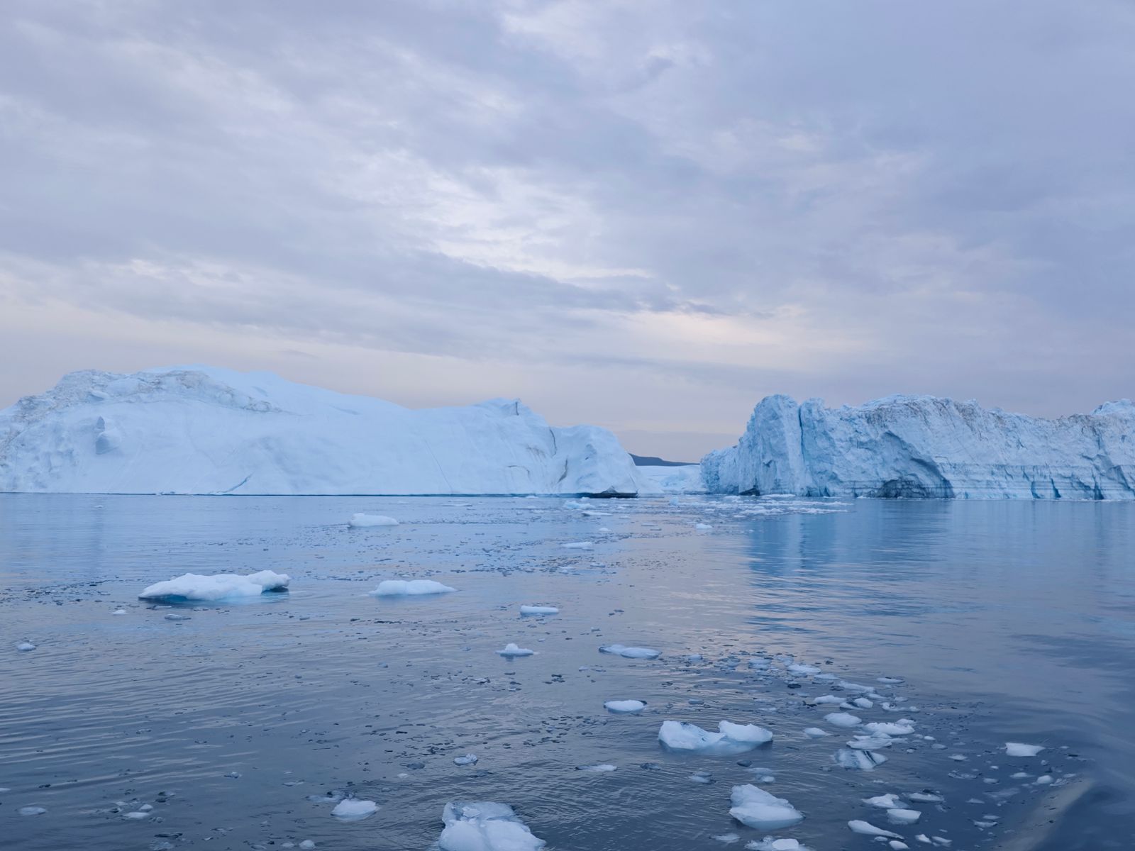 An der Mündung des Eisfjords beträgt die Wassertiefe nur 200 Meter, im Fjord selbst über 1000 Meter, so dass sich die Eisberge, die von Gletscher Sermeq Kujalleq kommen, genau an dieser Stelle „steckenbleiben“ und sich zu dem riesigen Eisfeld sammeln. Das ist auch einer der aktivsten Gletscher der Welt.