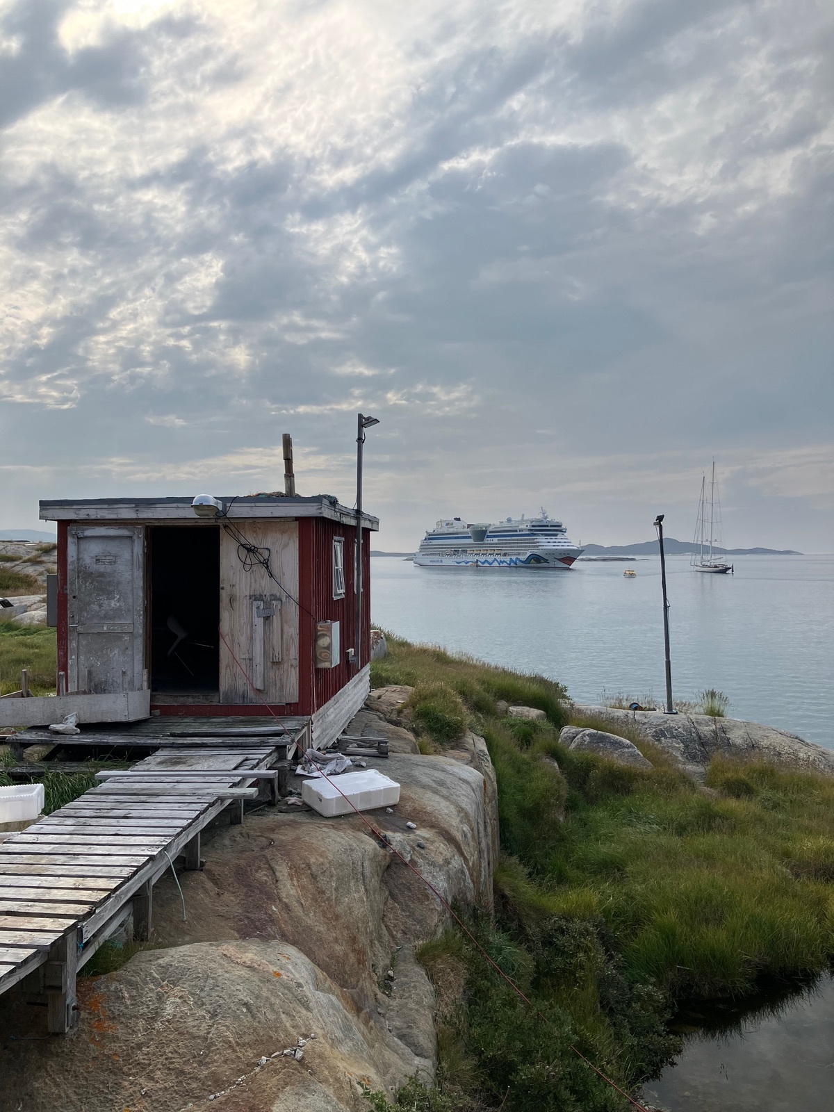 Hier kommt auch noch mein Bericht von gestern. Da ich erst einen späten Ausflug hatte, bin ich erst nach Ilimanaq in den Ort gefahren. Das Tendern stellte sich aber als sehr langwierig heraus, habe vom Anstellen auf Deck 3 (keine Schlange, stand fast direkt am Absperrband) bis zum Aussteigen an der Pier eine gute Stunde gebraucht. Da war es an der Pier leicht chaotisch, weil die individuellen Ausflugsboote die gleiche Pier nutzen und dadurch die Tenderboote teilweise nicht anlegen konnten. Als ich rübergefahren bin, waren wir drei volle Tenderboote in der Warteschleife zum Anlegen. Es soll sich aber im Laufe des Tages gebessert haben, der Kapitän ist selbst rübergefahren und soll das da geregelt haben. Aber ob das stimmt, weiß ich nicht, waren Gerüchte auf meinem späteren Ausflug. Gesehen habe ich den Kapitän aber an der Pier, er hat die Leinen von meinem Tenderboot angenommen und den Gästen persönlich die Stufe hoch geholfen.