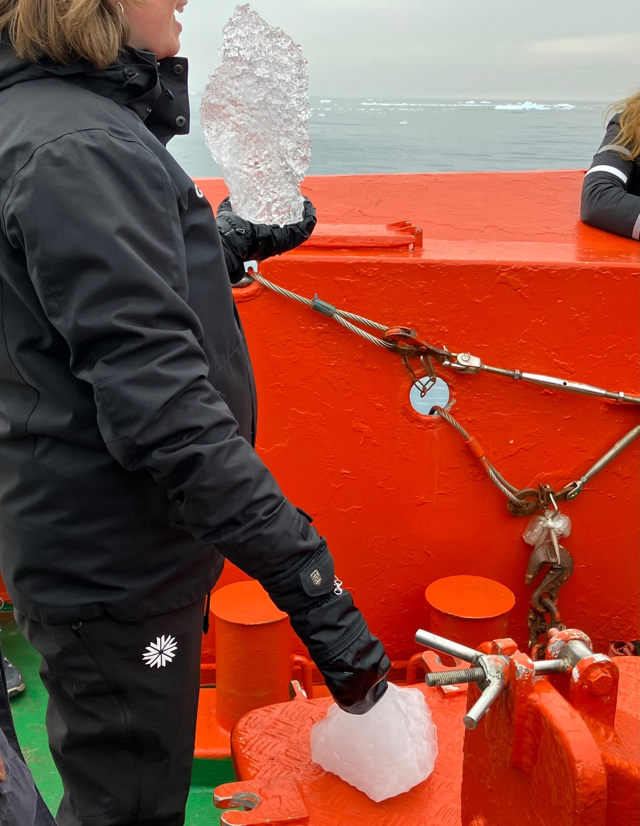 Das weiße Eis, der Brocken, der auf dem Foto liegt, besteht aus gepresstem Schnee wie die Gletscher und die Eisberge. Das schwarze Eis, was sie in der Hand hat, besteht aus gefrorenem Tauwasser und ist extrem hart und schwer.