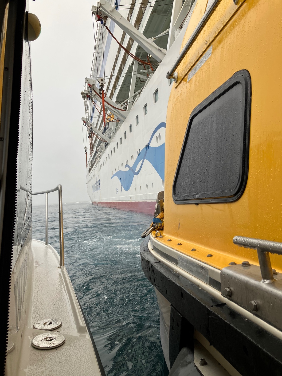 Stattdessen sind wir wieder durch das Eisfeld gefahren, wie gestern auch. Trotzdem hat sich die Wiederholung absolut gelohnt. Erstmal war die Fahrt an sich schon cool. Das war dieses Mal ein kleines Schnellboot mit 10 Sitzen, überdacht aber an den Seiten offen. Weil das so tief im Wasser liegt und sehr flach ist, mussten wir durch ein Tenderboot ein- und aussteigen.