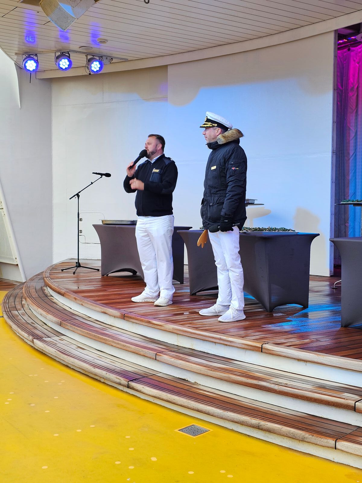 Heute ist es ziemlich stürmig, dennoch haben es sich Neptun und der Kapitän nicht nehmen lassen und sind zur Taufe erschienen: