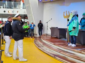 Heute ist es ziemlich stürmig, dennoch haben es sich Neptun und der Kapitän nicht nehmen lassen und sind zur Taufe erschienen: