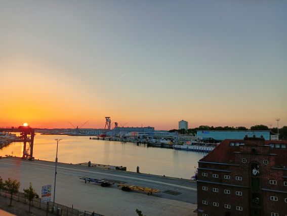 Doch zunächst einmal steigt um kurz 4 Uhr die Sonne über dem weiten Horizont auf. Der blaue Himmel verspricht einen sonnigen Tag, doch die kleinen Schaumkämme auf dem tintenblauen Wasser können den starken Wind nicht leugnen. Gegen 05:30 Uhr beginnt unser großes Schiff, sich den Bewegungen der Wellen anzupassen und schaukelt leicht. Gedanklich habe ich Skagen eigentlich schon abgeschrieben. Dennoch drücke ich so sehr die Daumen, dass unser Anlauf dieses Hafens doch gelingen wird.