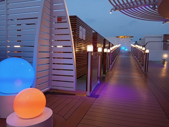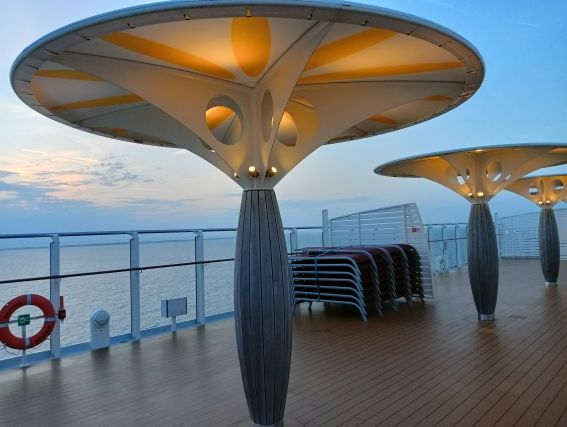 Gegen 22:30 Uhr nutze ich die „blaue Stunde“ für einen Spaziergang an Deck. Die Sonne ist inzwischen hinter dem Horizont verschwunden, die Stimmung auf dem nahezu menschenlosen Pooldeck mit seiner bunten Beleuchtung so schön. So still, so friedlich wieder einmal.