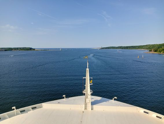 Kurz vor dem „Sail Away“ um 17:15 Uhr meldet sich Kapitän Miklitza. Da morgen früh in der Gegend um Kopenhagen, unserer nächsten Destination, wieder ein Starkwindfeld erwartet wird, werden wir bereits zwei Stunden früher in der Hauptstadt Dänemarks anlegen.