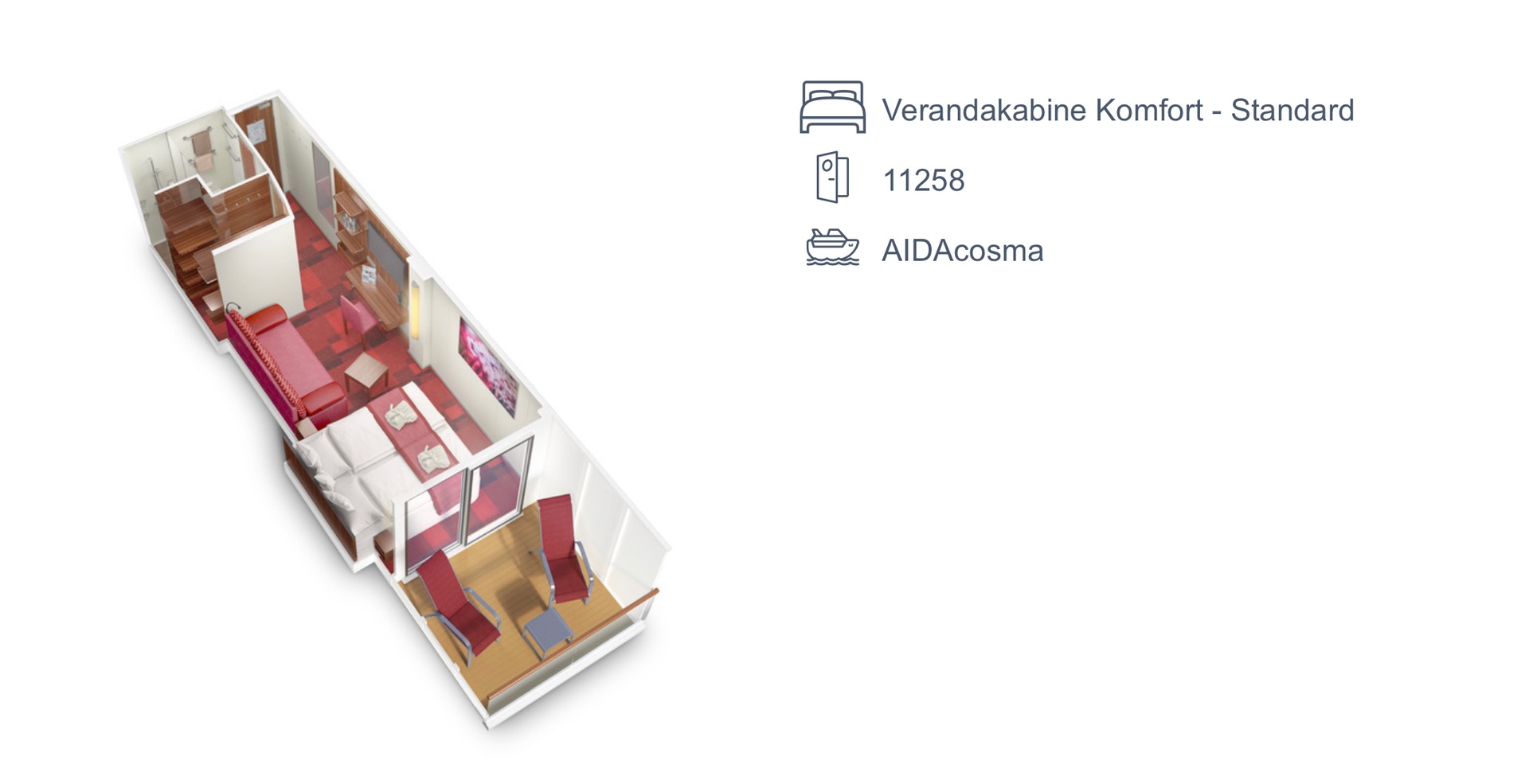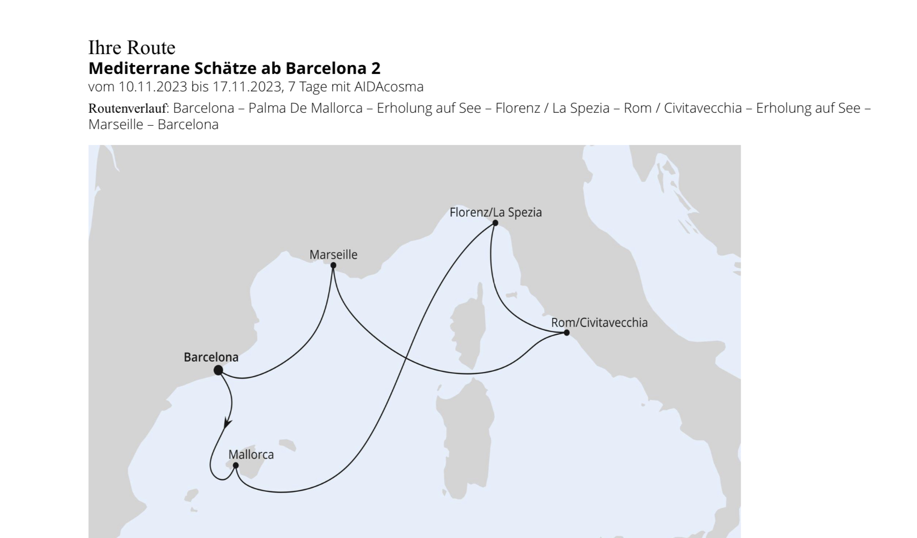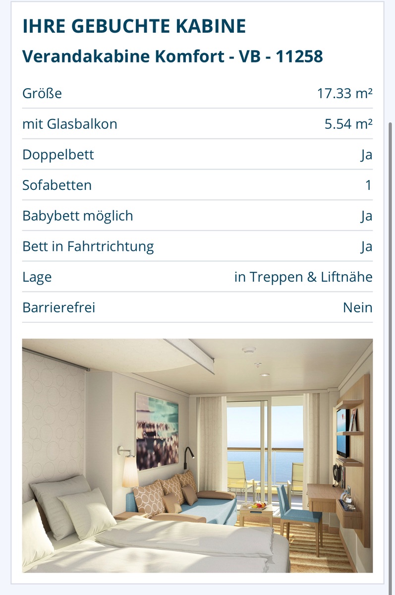 AIDA Cosma - Mediterrane Schätze von Barcelona - 10.11. - 17.11.23 - gebucht für zwei Erwachsene in einer Veranda Komfort Kabine auf Deck 11 - Kabinennummer ist 11258 - mit Selbstanreise (excl. Flug) - 1200,- Euro!!! für zwei Erwachsene.