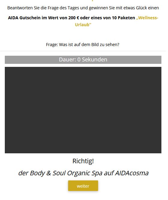 Der Tagesgewinn ist ein AIDA Gutschein im Wert von 200 € oder eines von 10 Paketen „Wellness-Urlaub“