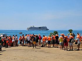 Gefühlt stand das ganze Schiff in Rettungswesten am Hafen und wartete, auf die Speedboote verteilt zu werden.