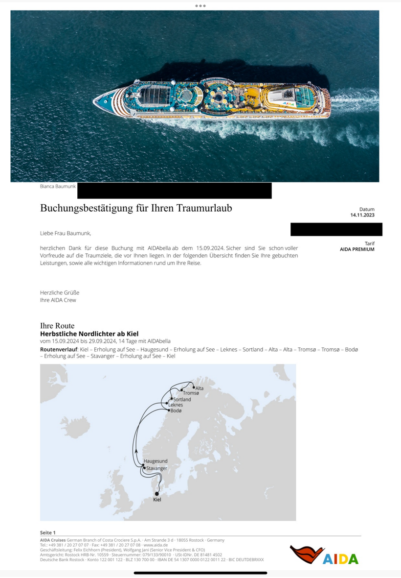 Der Gesamtpreis der Reise beträgt 6090€. Wir würden die Reise für 1400€ plus Restzahlung an Aida abgeben.