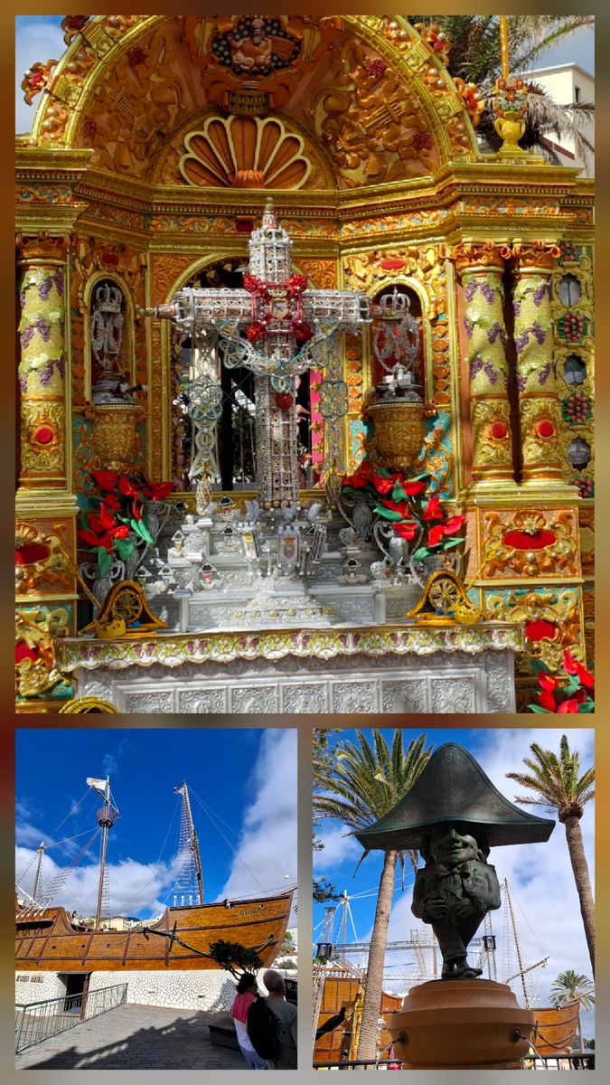Am Ende der Bimmelbahnfahrt staunten wir über das nachgebaut Schiff Msria von Columbus. Der nachgebaute Altar gehörte zu der gestrigen Prozession zu Ehren von "Unserer Dame vom Schnee".