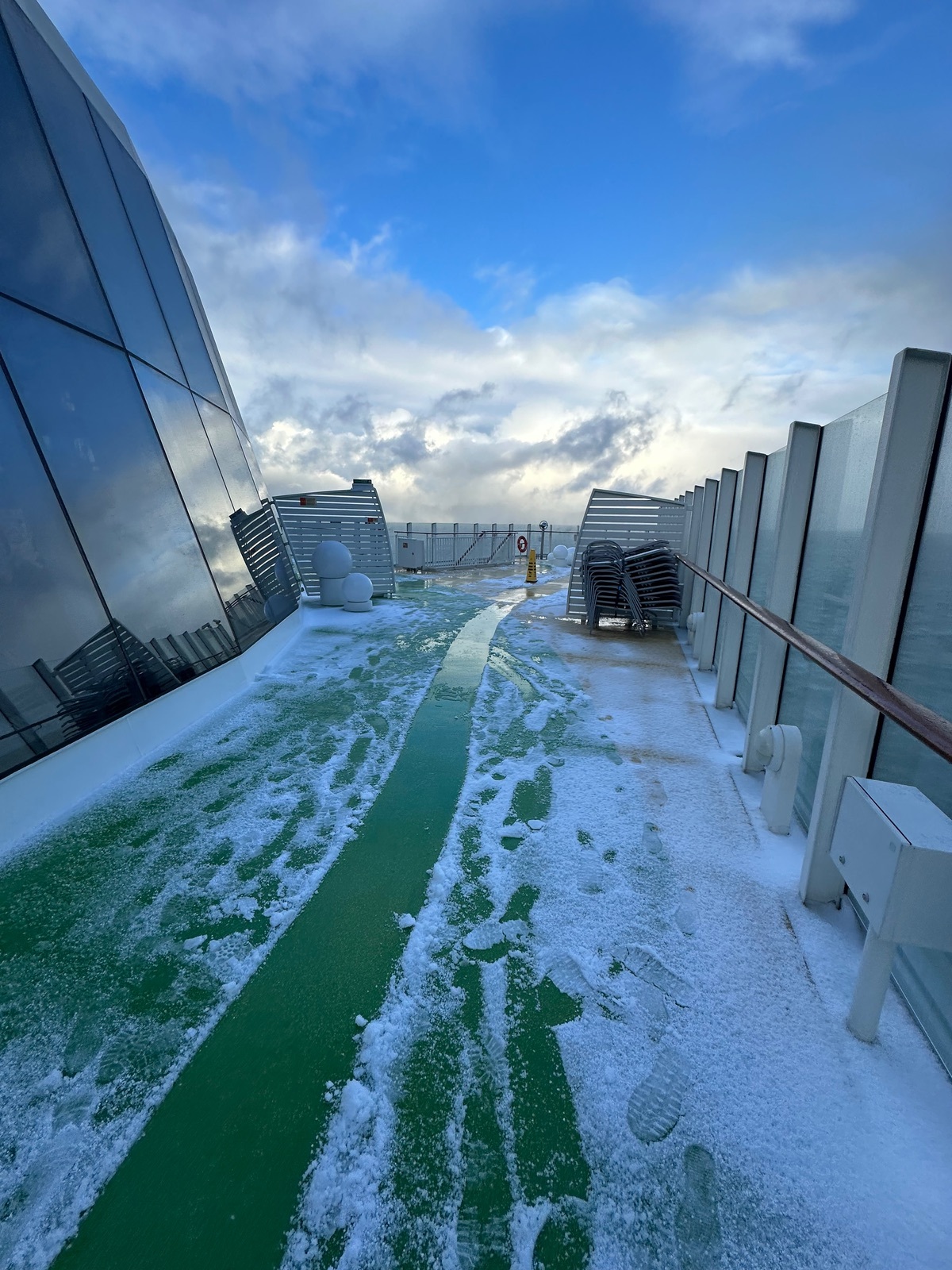 Der Schnee gestern Nachmittag an Bord war ja nichts dagegen, obwohl es wirklich nicht zu unterschätzen war, wie spiegelglatt es wurde.