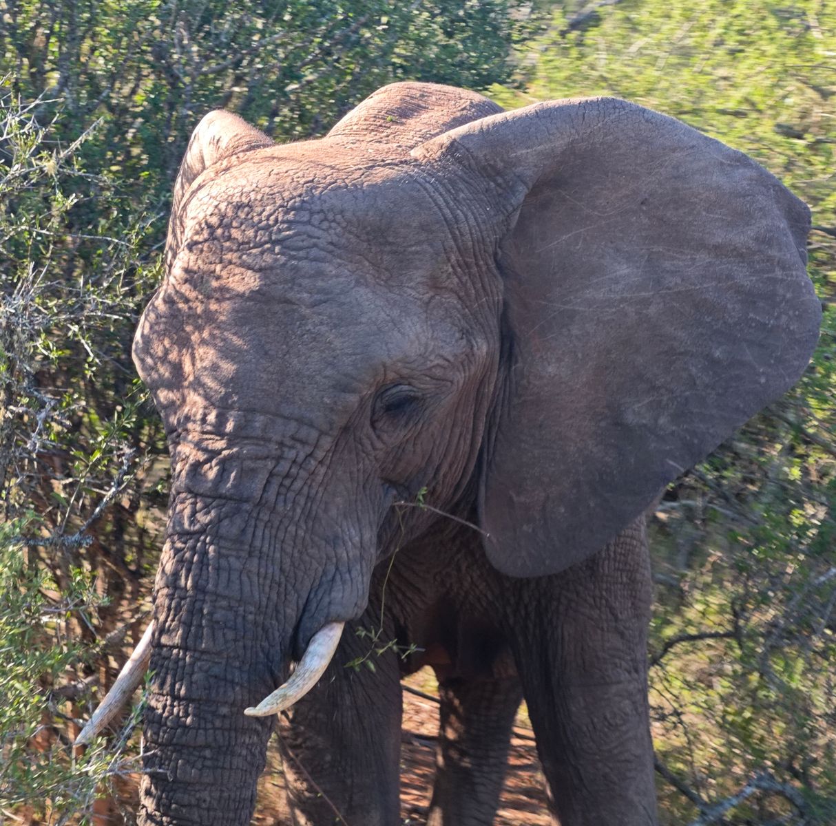 Und wenn einer dann weniger als einen Meter an einem vorbeiläuft, von ihm seitlich anvisiert wird, dann wird einem in dem offenen Geländewagen doch ein wenig komisch, hofft auf Freundschaft und denkt u. a. an den langen Rüssel, der gerade noch halbe Büsche zum Fressen rausgerissen hat. Einfach mal so...