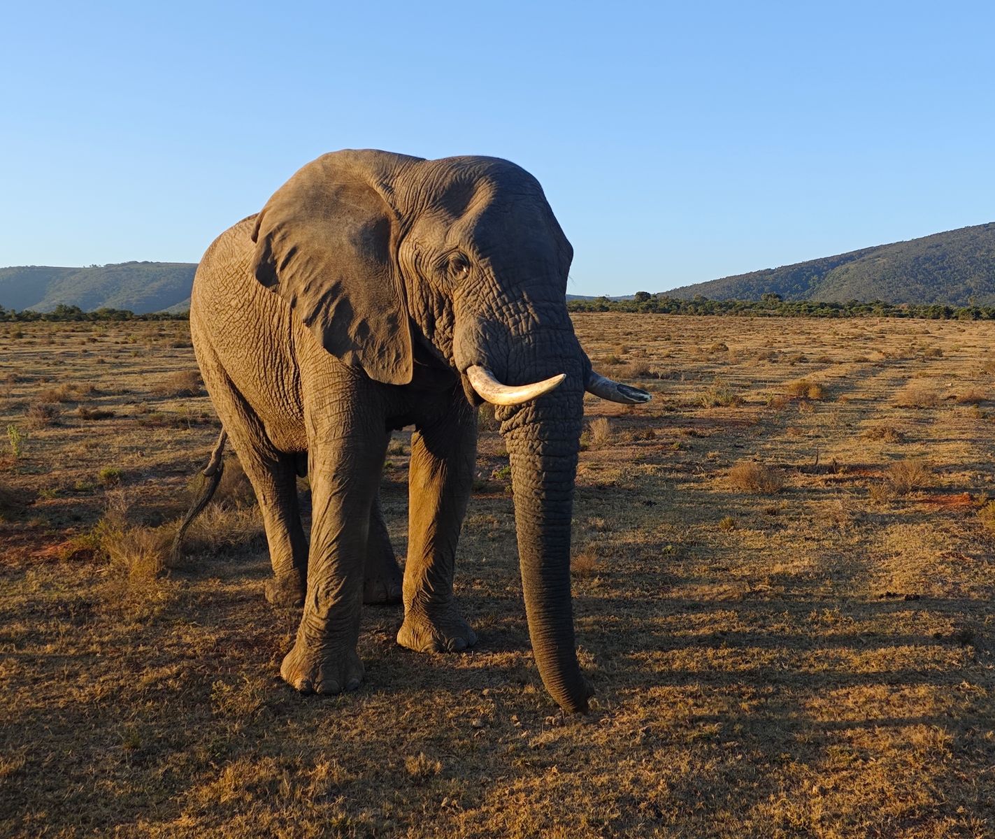 Im Abendlicht, der Elefantenbulle hat uns fast erreicht,