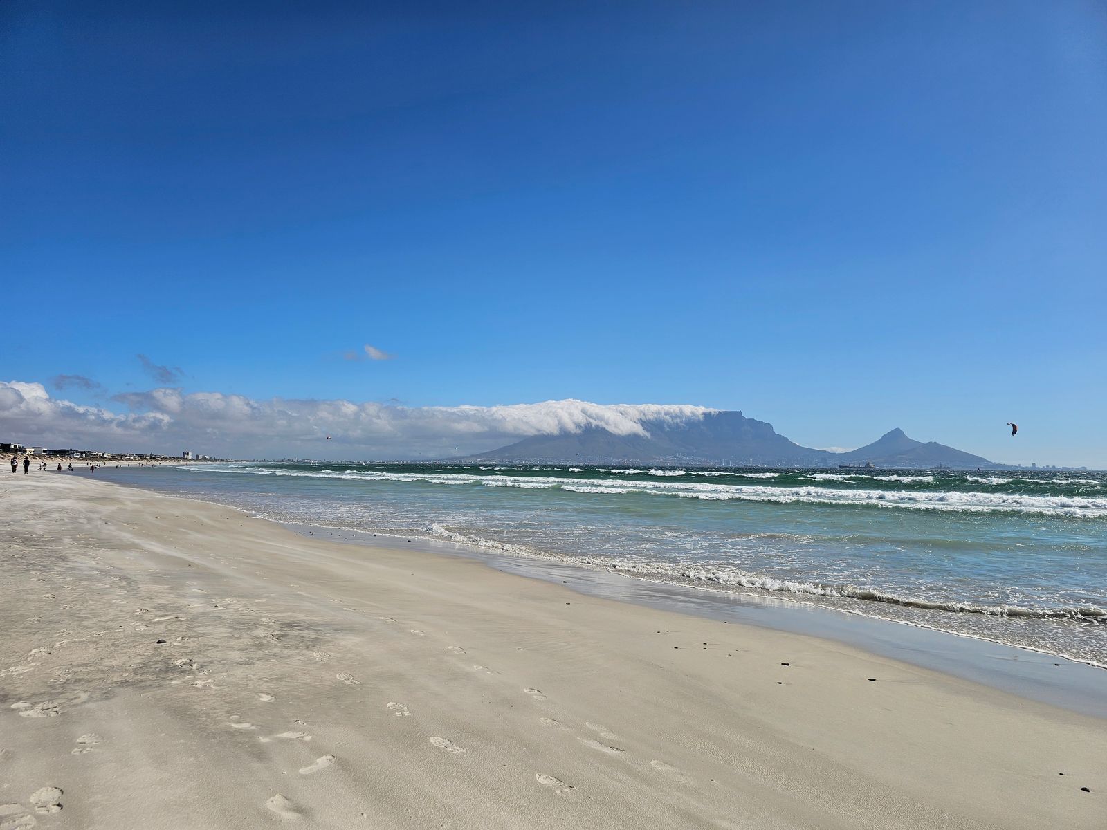 Von der Terrasse und unserem Zimmer hat man einen tollen Blick auf den Tafelberg. Der Strand ist direkt vor der Tür. Dort war es aber ziemlich windig. Gab ein gratis Sandpeeling: