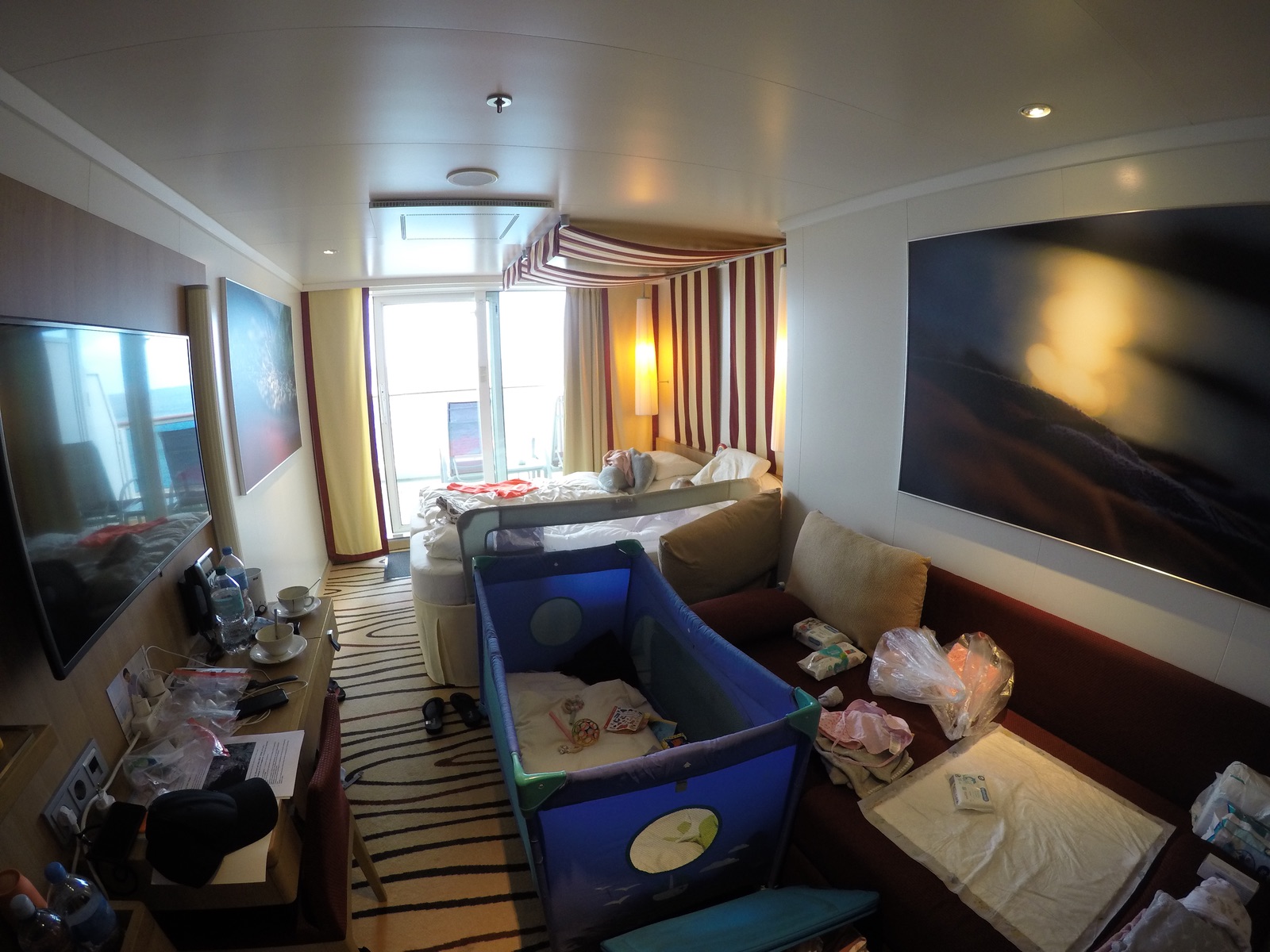Die Kabine ist eine Verandakabine Komfort mit begehbarem Kleiderschrank, einem Doppelbett und einem Sofa. Das Doppelbett steht direkt an der Balkontür. Das ist anders als auf dem Kabinenfinder von AIDA zusehen. Finde ich aber nicht schlimm. Wir hatten in der Kabine noch ein Babybett, welches vor dem Sofa stand.
