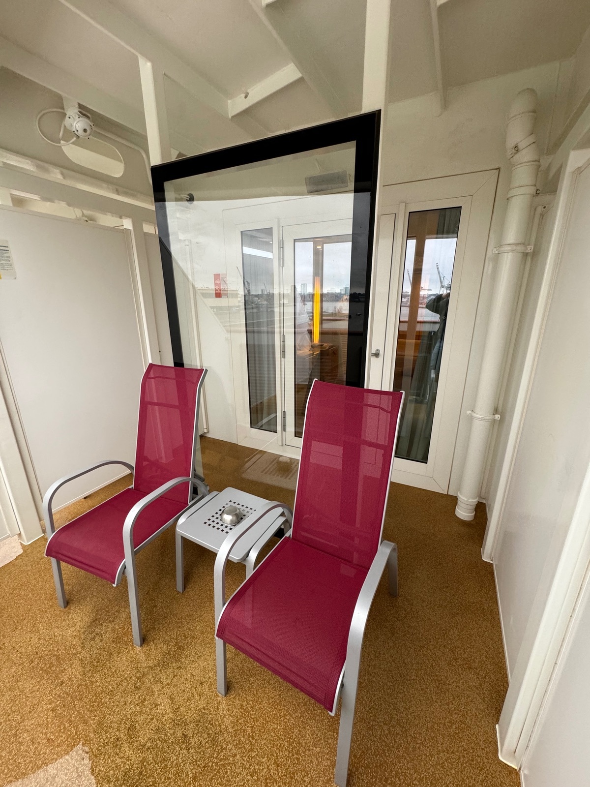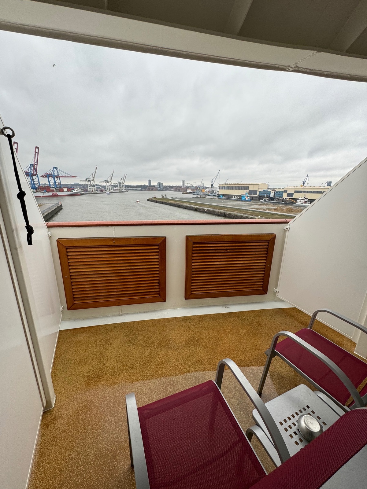 Der Ausblick ist toll, bedingt durch den Stahlbalkon aber nicht aus dem Bett zu genießen. Die Balkontür ist keine Schiebetür und durch eine Glaswand etwas gegen den Wind geschützt. Auf der Metropolentour ab 03.02.24 bei bis zu Windstärke 9 hat es aber trotzdem zeitweise noch reingepfiffen. Allerdings war das nur bei extremen Wind von vorne der Fall.