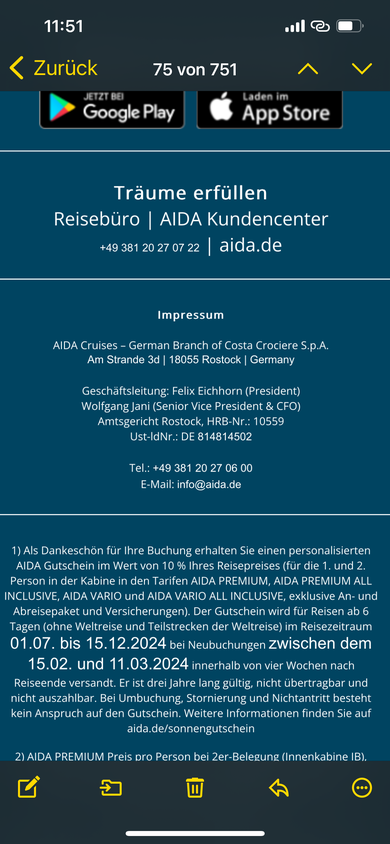 MyAida , versuche es bei Aida kommende Woche in aller Geduld und Ruhe (telefonisch oder besser auch schriftlich) abzuklären. ![]()