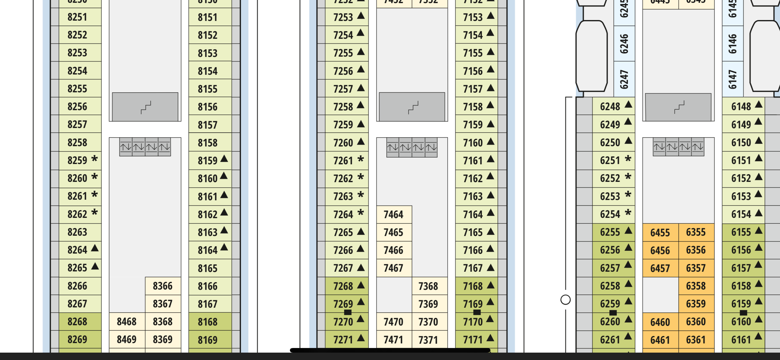 Im Gegenzug werden auf den gleichen Decks 8, 7 und 6 auf der Backboardseite je 4 Kabinen je Deck (jeweils wieder direkt übereinander) umgewandelt von 3er-Kabine in 4er Kabinen.
