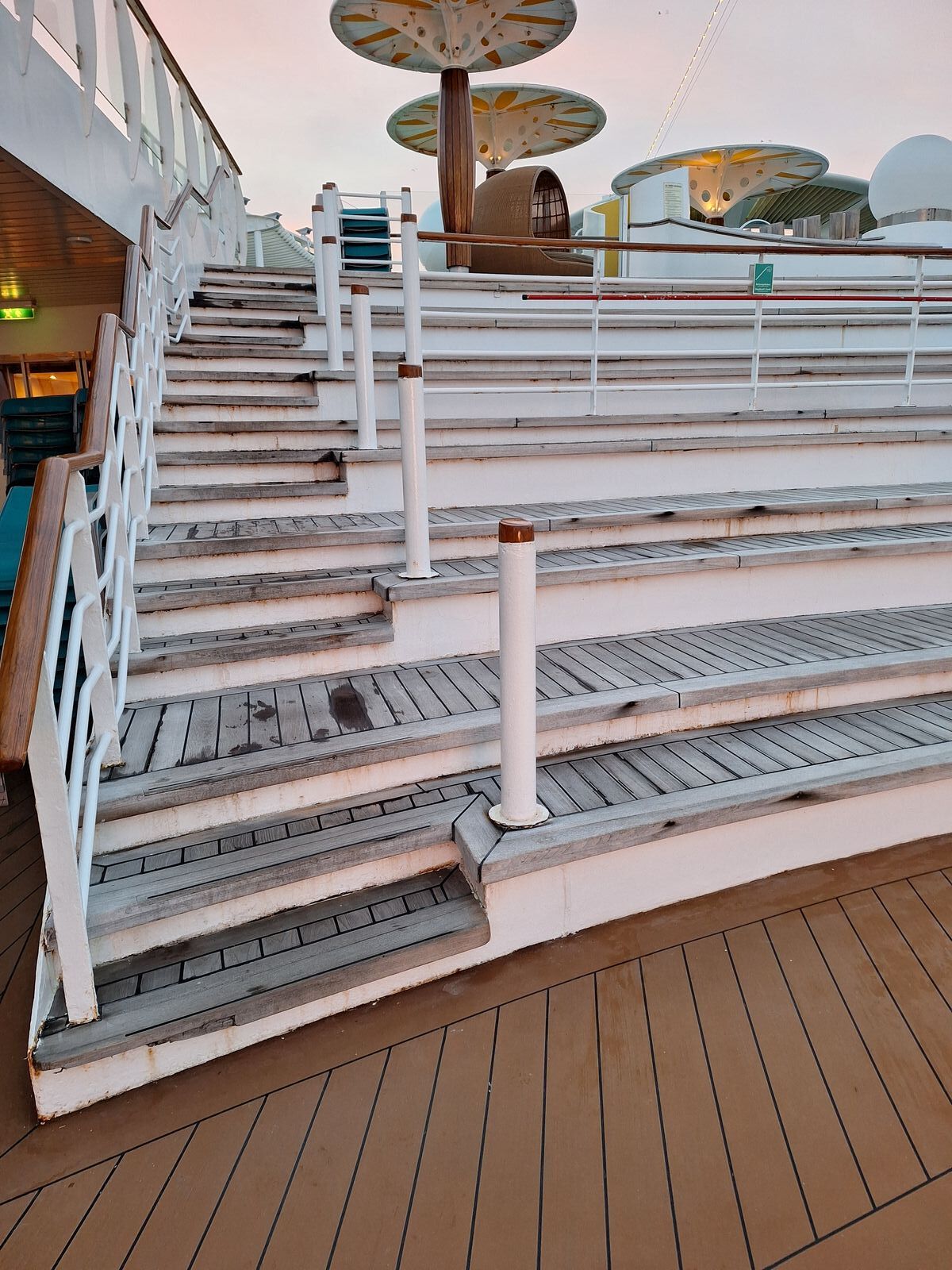 Ich denke, die Stufen werden wie auf allen Schiffen aus Holz bleiben. Der restliche Boden wurde offensichtlich zumindest teilweise schon mal erneuert, der Fake-Holzboden gefällt mir auf jeden Fall besser als der gelbe oder grüne Gummiboden.