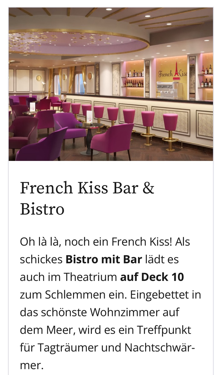 Dann wird es noch ein French-Kiss-Bistro geben. Das ist dann aber eher was für zwischendurch und wohl auch nicht reservierbar.