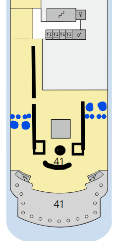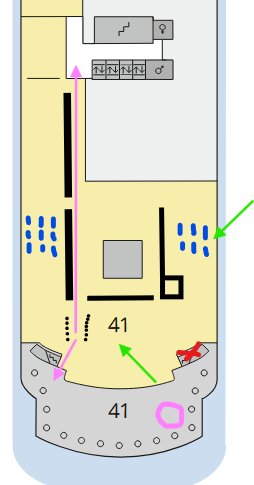 Erst dachte ich das zweite Bild blickt auf die Pizzastationen, aber das helle Tageslicht darüber spricht eher für die andere Seite und einen Blick Richtung Heck. Die Bilder sind meiner Meinung nach also aus den Richtungen der grünen Pfeile aus aufgenommen. Auf dem ersten Bild sieht man blau eingerahmt einen Hüfthohen Gitterzaun. Dadurch werden sie die Lanai Bar Gäste außerhalb der Restaurantöffnungszeiten schleusen. Das Restaurant werden sie wahrscheinlich mit Kordeln wie im Yachtclub absperren. Vom Treppenhaus kommend geht es die Buffetzeile runter und dann durch den ehemaligen Schinkenstand durch (Weg begradigt) und dann am Zaun vorbei nach draußen. Wenn ich mich nicht täusche, dann wollen sie im wesentlichen das ganze Restaurant pflastern und keinen Teppich mehr zu verlegen.