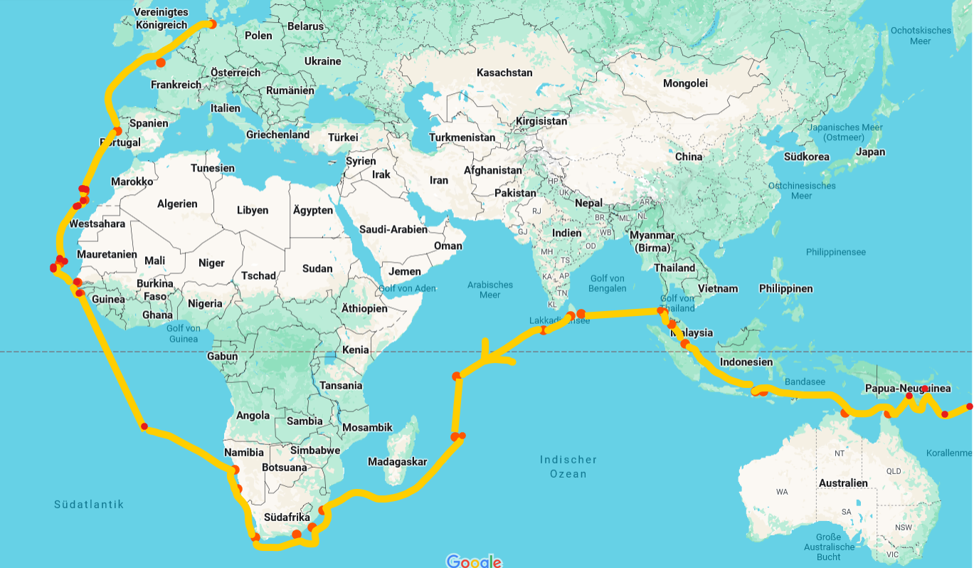 Ich habe noch mal die Distanzen im Pazifik abgesteckt. Anders als mit dem ersten Bauchgefühl dürfte das recht gut passen, um rechtzeitig zu Sylvester nach Sydney zu kommen. Von der Sydney Variante würde ich aktuell zu 99% ausgehen. Eine Variente mit Thahiti, Bora Bora, weiteren Südseeinseln und ein paar Häfen in Papua und ggf Cairns (fürs GBR) wäre die Alternative.