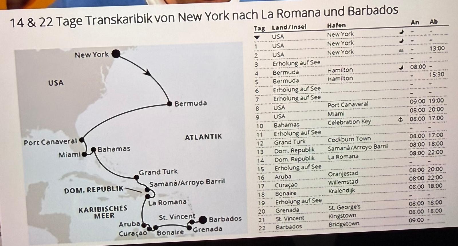 Die 22 Tage-Tour würde doch in Barbados enden, also dann eine weitere Woche bis La Romana, wo am 20.11. die erste Karibikrunde buchbar ist. Also wäre Start am 24.10.