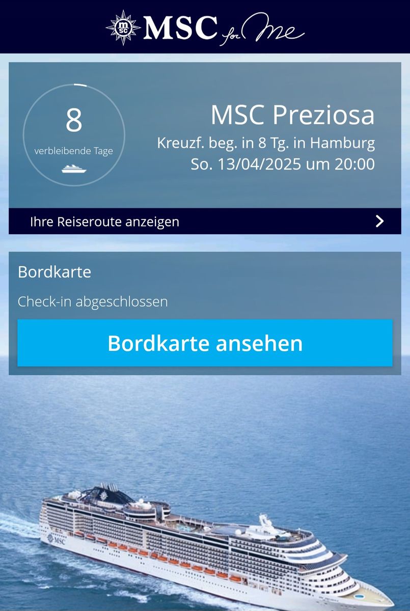• RE: MSC Preziosa: 7 Nächte ab/bis Hamburg | 7 Nächte | 13.04.2025 bis 20.04.2025 (Sonntag, 13. April 2025, 00:00-Sonntag, 20. April 2025, 00:00)